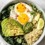 - Assemble Bowl: Start with a base of cooked quinoa in each bowl. Top with sautéed kale, sliced avocado, halved soft boiled eggs, and dollops of dairy-free pesto. Optionally, sprinkle with red pepper flakes for extra heat.